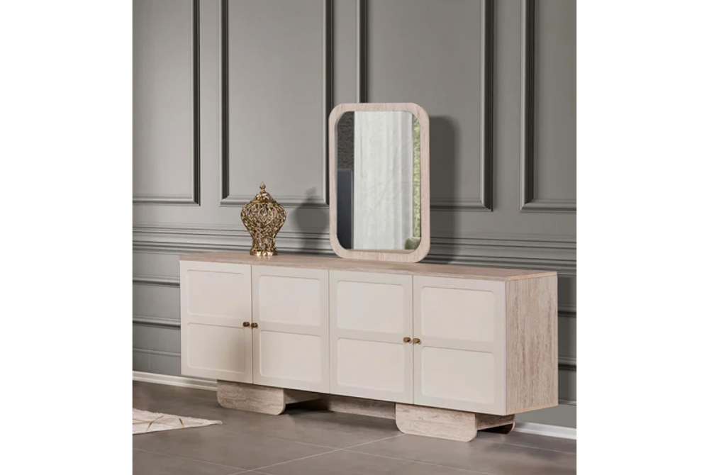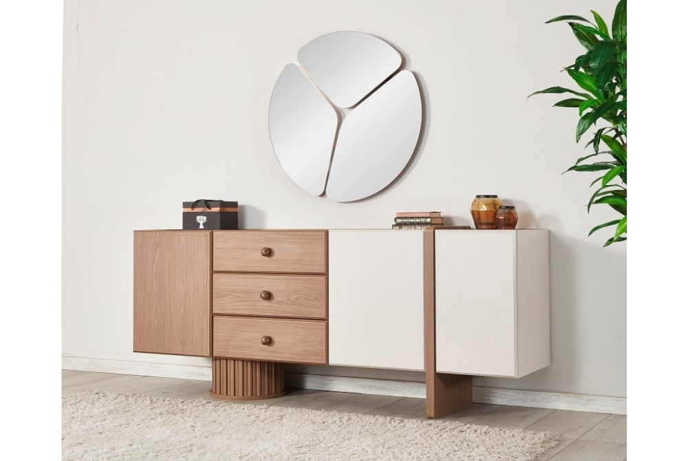Larina Konsol + Ayna, modern ve şık tasarımıyla yemek odası veya salon dekorasyonunu tamamlayan fonksiyonel bir mobilyadır. %100 birinci sınıf yonga levha malzemeden üretilmiş olup dayanıklı ve uzun ömürlü kullanım sunar. Geniş yüzeyi sayesinde dekoratif objeler, çerçeveler veya aydınlatma ürünleri için ideal bir alan oluşturur. Konsol aynası ile birlikte kullanıldığında bulunduğu ortama derinlik ve ferahlık katar. Modern çizgilere sahip tasarımı sayesinde farklı dekorasyon stilleri ile kolayca uyum sağlar.
