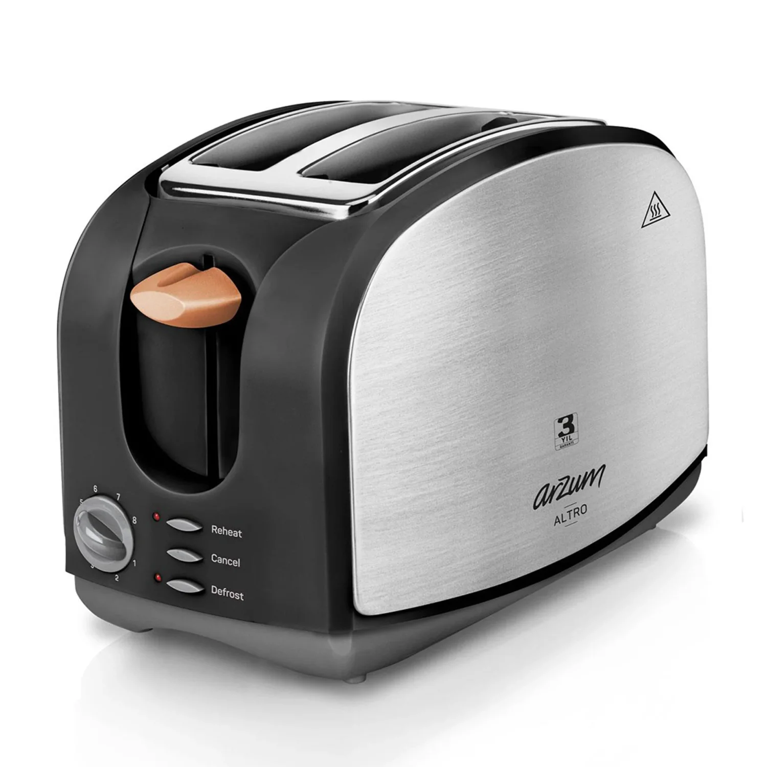 Arzum AR2014 Altro Siyah Ekmek Kızartma Makinesi, 900 W gücünde olup aynı anda 2 dilim ekmek kızartma kapasitesine sahiptir. 8 farklı kızartma kademesi sayesinde ekmeğinizi tam istediğiniz kıvamda kızartabilirsiniz. Buz çözme (defrost), yeniden ısıtma (reheat) ve kızartmayı durdurma (cancel) fonksiyonlarıyla donatılmıştır. Çıkarılabilir kırıntı tepsisi sayesinde temizlik oldukça kolaydır. Metal gövdesi hem dayanıklılık sağlar hem de mutfağınıza şık bir görünüm kazandırır.