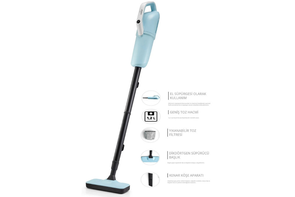 550W motor gücü ile güçlü ve verimli temizlik performansı sunan bu elektrikli süpürge, günlük kullanım için ideal bir çözümdür Torbasız 1.2 litre geniş toz haznesi sayesinde uzun süre boşaltma ihtiyacı olmadan kullanım imkânı sağlar
