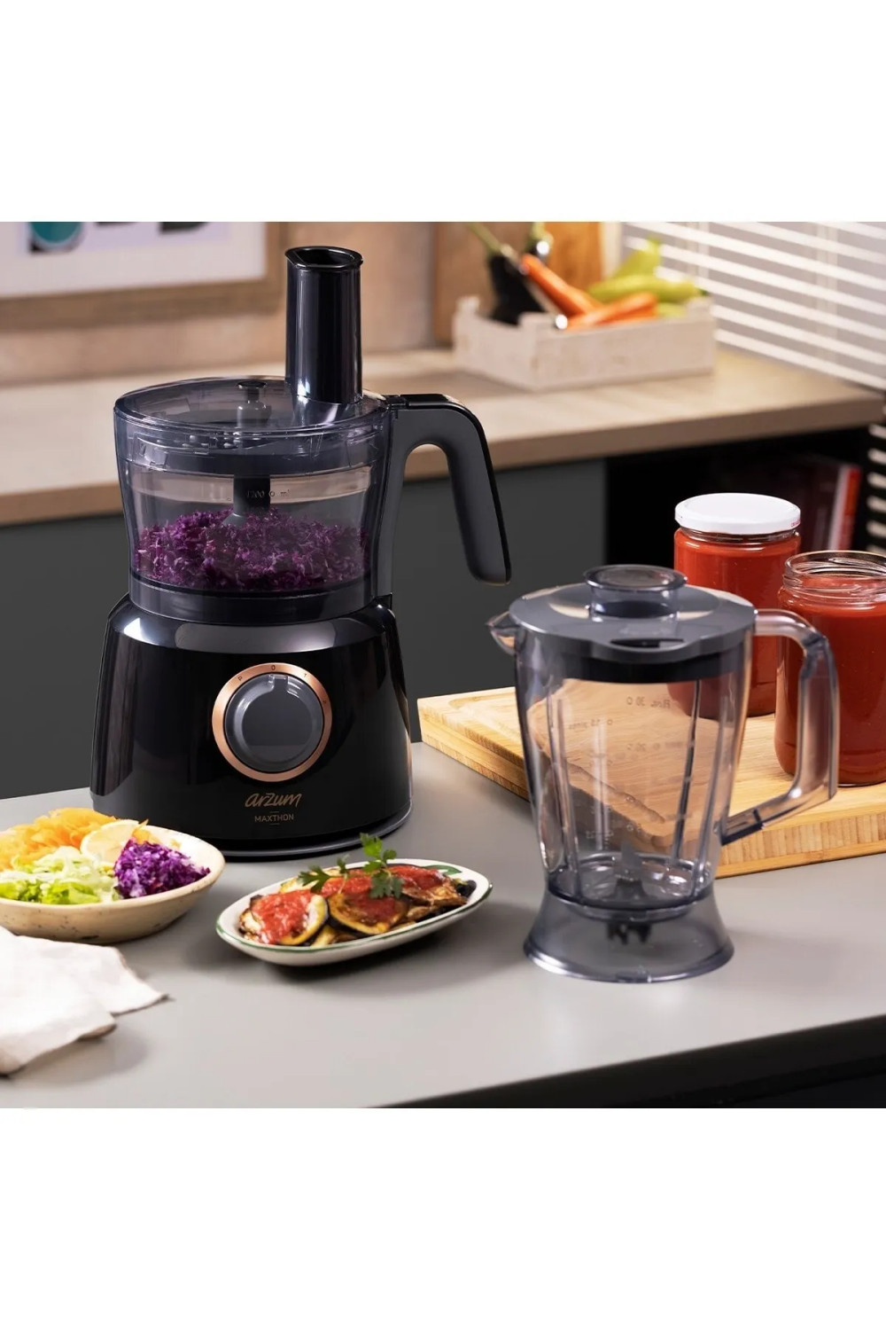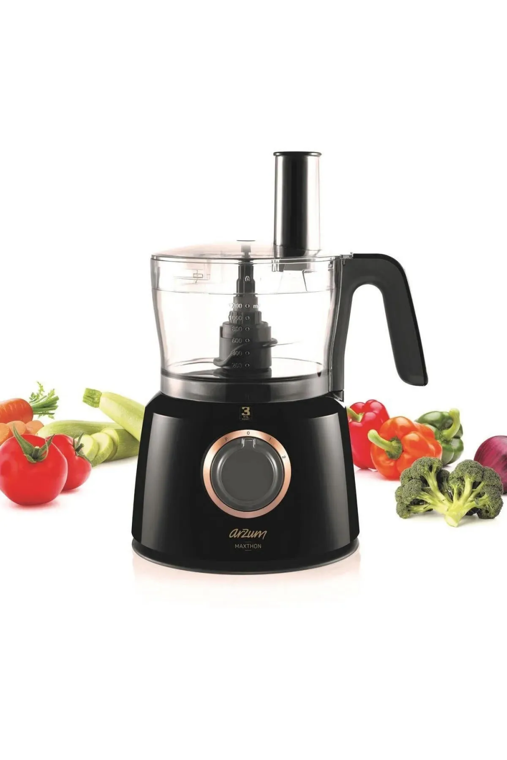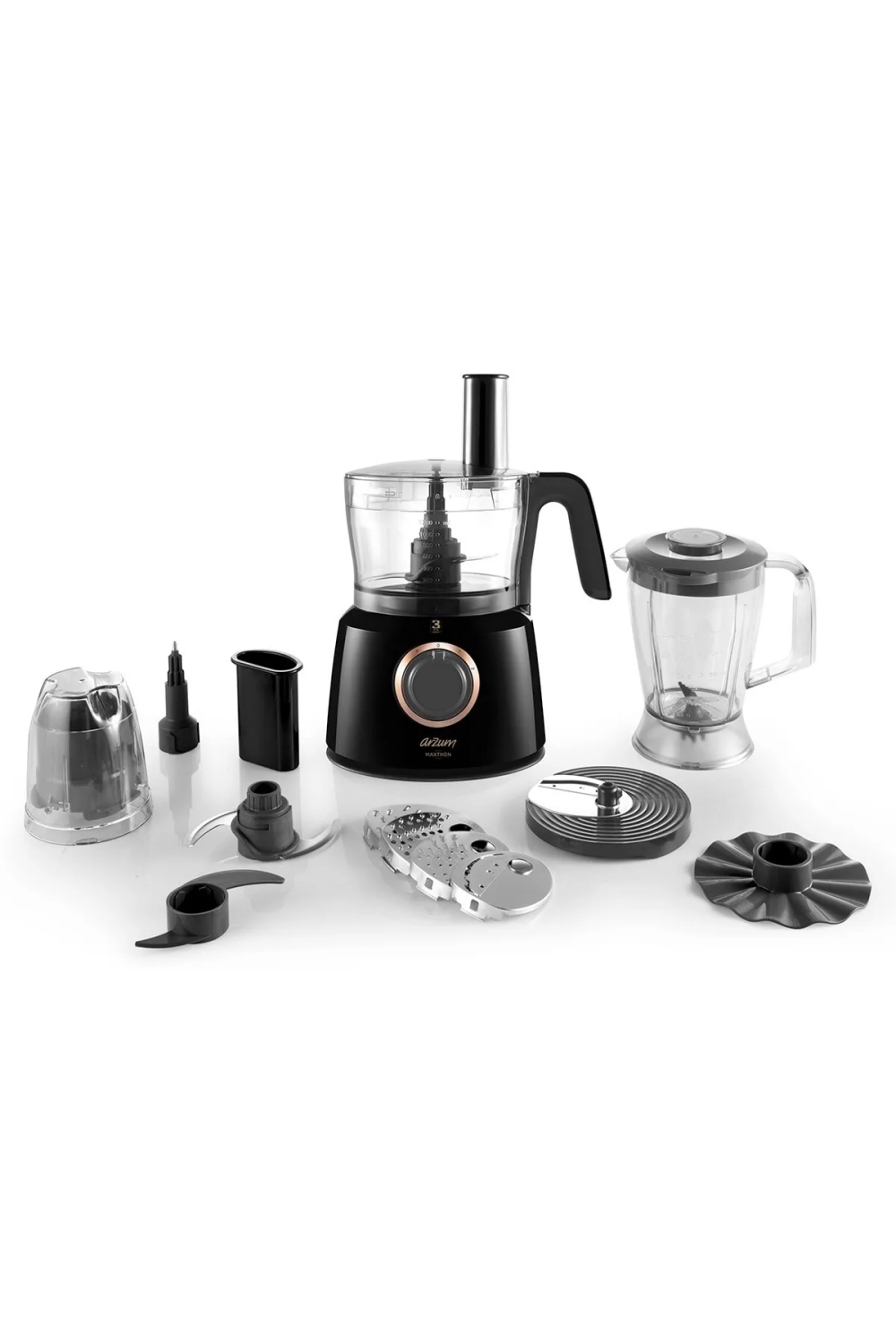 Arzum Maxthon AR1064 Siyah Mutfak Robotu, 1000W güçlü motoru ile doğrama, rendeleme, dilimleme, karıştırma ve öğütme işlemlerini kolayca gerçekleştirir. 1,2 litrelik işlem haznesi ve 1 litrelik sürahi blender ile sos, çorba, smoothie ve bebek maması gibi tarifler hazırlanabilir. Kahve ve baharat öğütme aparatı sayesinde taze öğütülmüş lezzetler elde edilebilir. 2 farklı hız kademesi ve pulse fonksiyonu ile kontrol sizde. İnce-kalın rende, dilimleme bıçağı ve taşıyıcı disk gibi aksesuarlarıyla çok yönlü kullanım sunar. Paslanmaz çelik ve dayanıklı plastik malzemelerle üretilmiş olan bu robot, mutfakta hem şık hem de fonksiyonel bir yardımcıdır