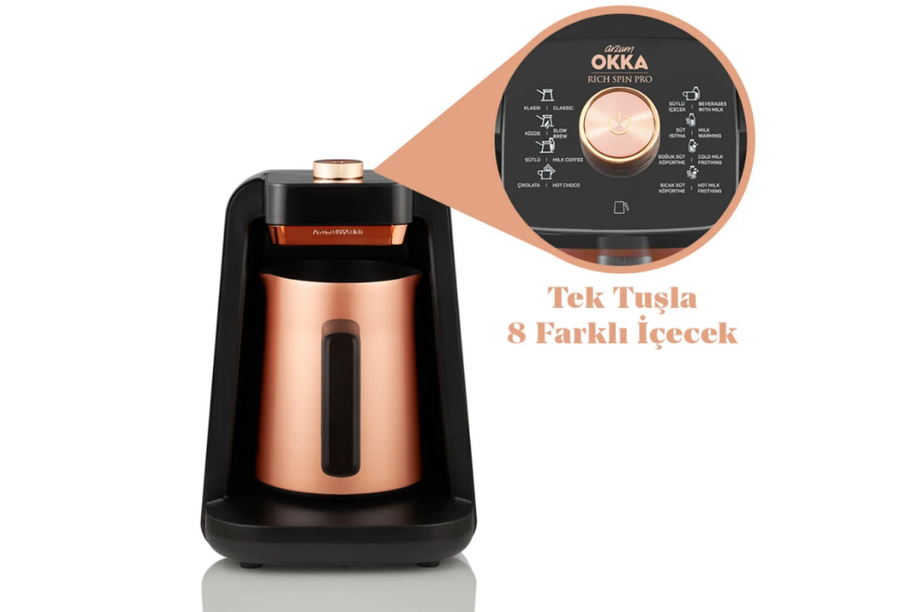Arzum Okka Rich Spin Pro OK0020 Bakır, Türkiye’de ilk karıştırıcılı cezveli sütlü Türk kahve makinesidir. 5 fincan kapasitesiyle bol köpüklü kahveleri tek seferde hazırlayabilir. Karıştırıcılı paslanmaz çelik cezvesi sayesinde sade, sütlü ve közde Türk kahvesi gibi farklı tarifleri otomatik olarak karıştırarak tam kıvamında pişirir. 8 farklı moduyla sıcak çikolata, sütlü içecek, süt ısıtma, sıcak/soğuk süt köpürtme gibi içecekler de hazırlanabilir. Auto Brewing Altitude Detection teknolojisi sayesinde dünyanın her yerinde aynı lezzette kahve sunar. Sesli ve ışıklı uyarı sistemi, sıcaklık ayarı ve kolay temizlenebilir cezve yapısıyla mutfağınızda profesyonel bir kahve deneyimi yaşatır.