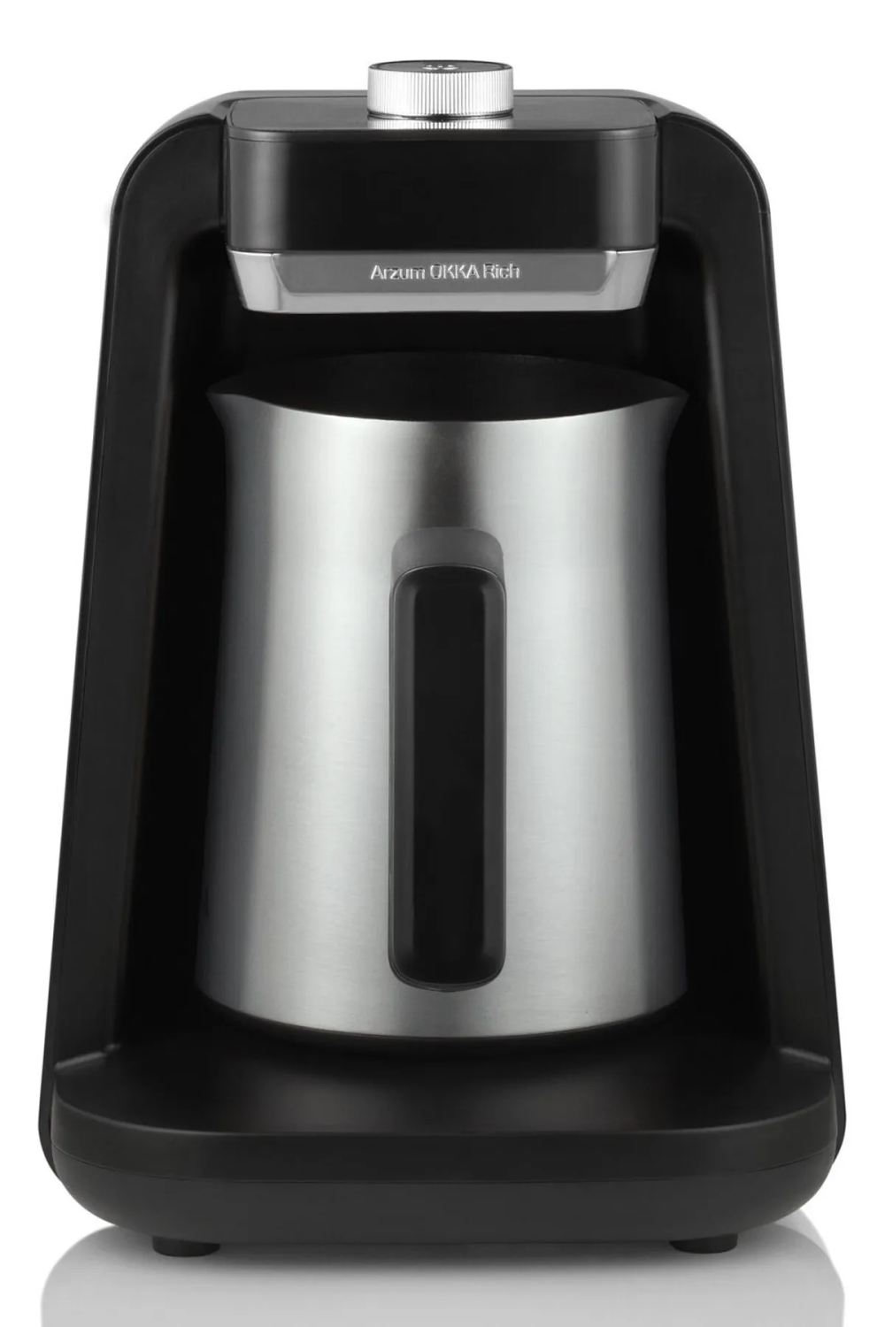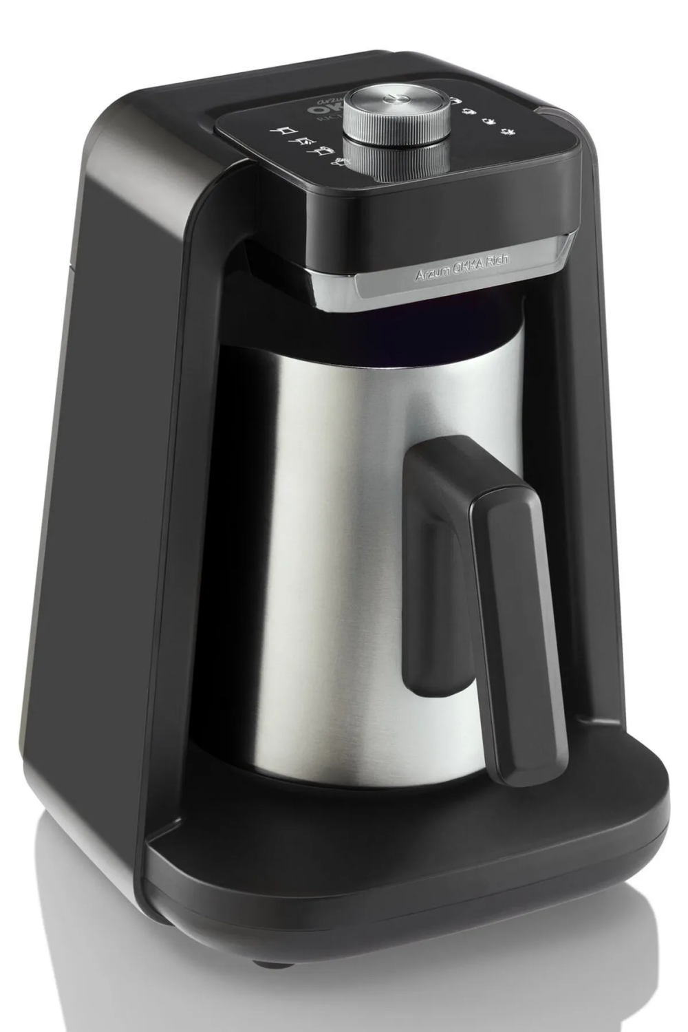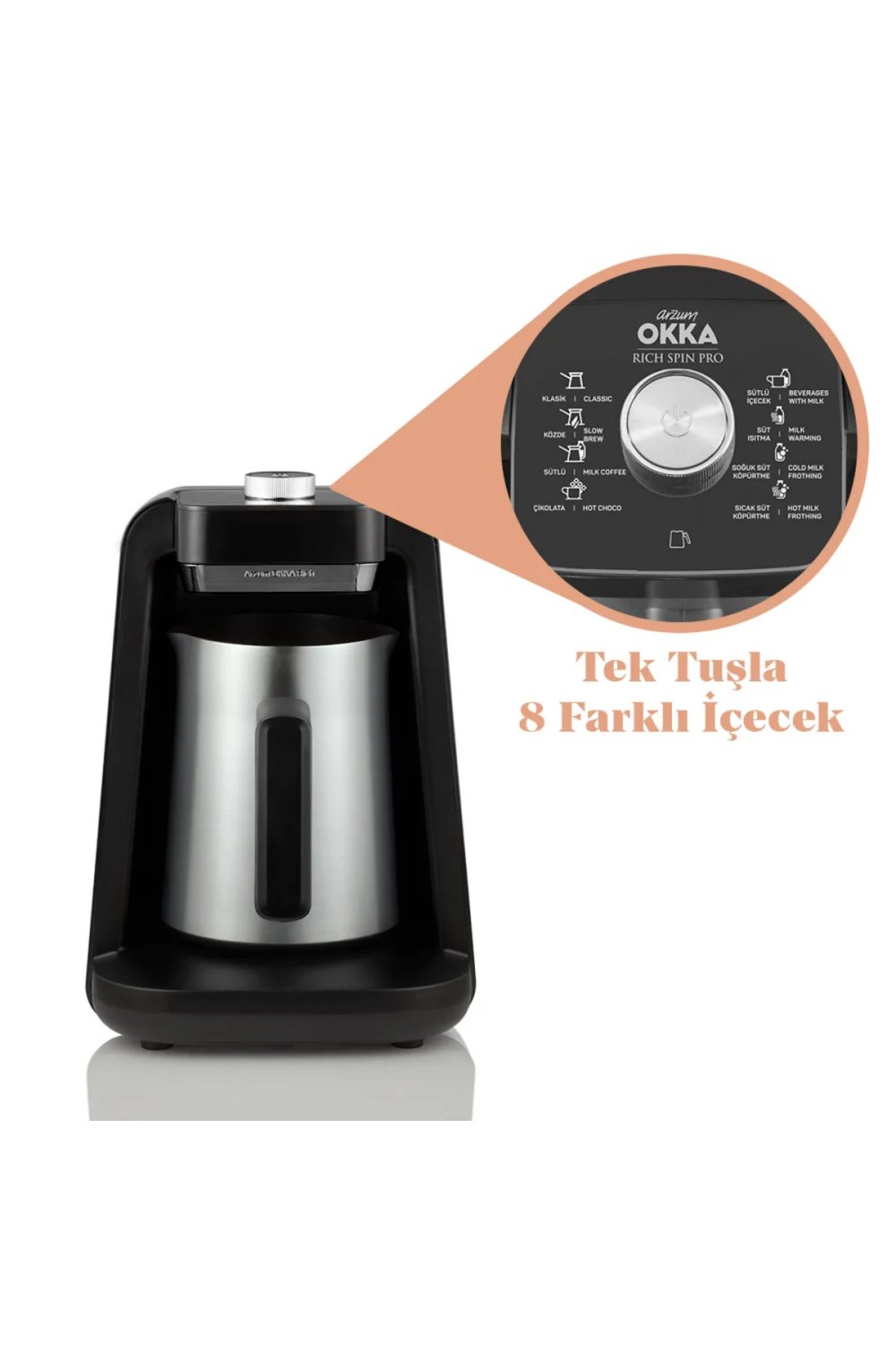 Arzum Okka Rich Spin Pro OK0020 Krom, Türkiye’de ilk karıştırıcılı cezveli sütlü Türk kahve makinesidir. 5 fincan kapasitesiyle bol köpüklü kahveleri tek seferde hazırlayabilir. Karıştırıcılı paslanmaz çelik cezvesi sayesinde sade, sütlü ve közde Türk kahvesi gibi farklı tarifleri otomatik olarak karıştırarak tam kıvamında pişirir. 8 farklı moduyla sıcak çikolata, sütlü içecek, süt ısıtma, sıcak/soğuk süt köpürtme gibi içecekler de hazırlanabilir. Auto Brewing Altitude Detection teknolojisi sayesinde dünyanın her yerinde aynı lezzette kahve sunar. Sesli ve ışıklı uyarı sistemi, sıcaklık ayarı ve kolay temizlenebilir cezve yapısıyla mutfağınızın baristası olmaya aday.