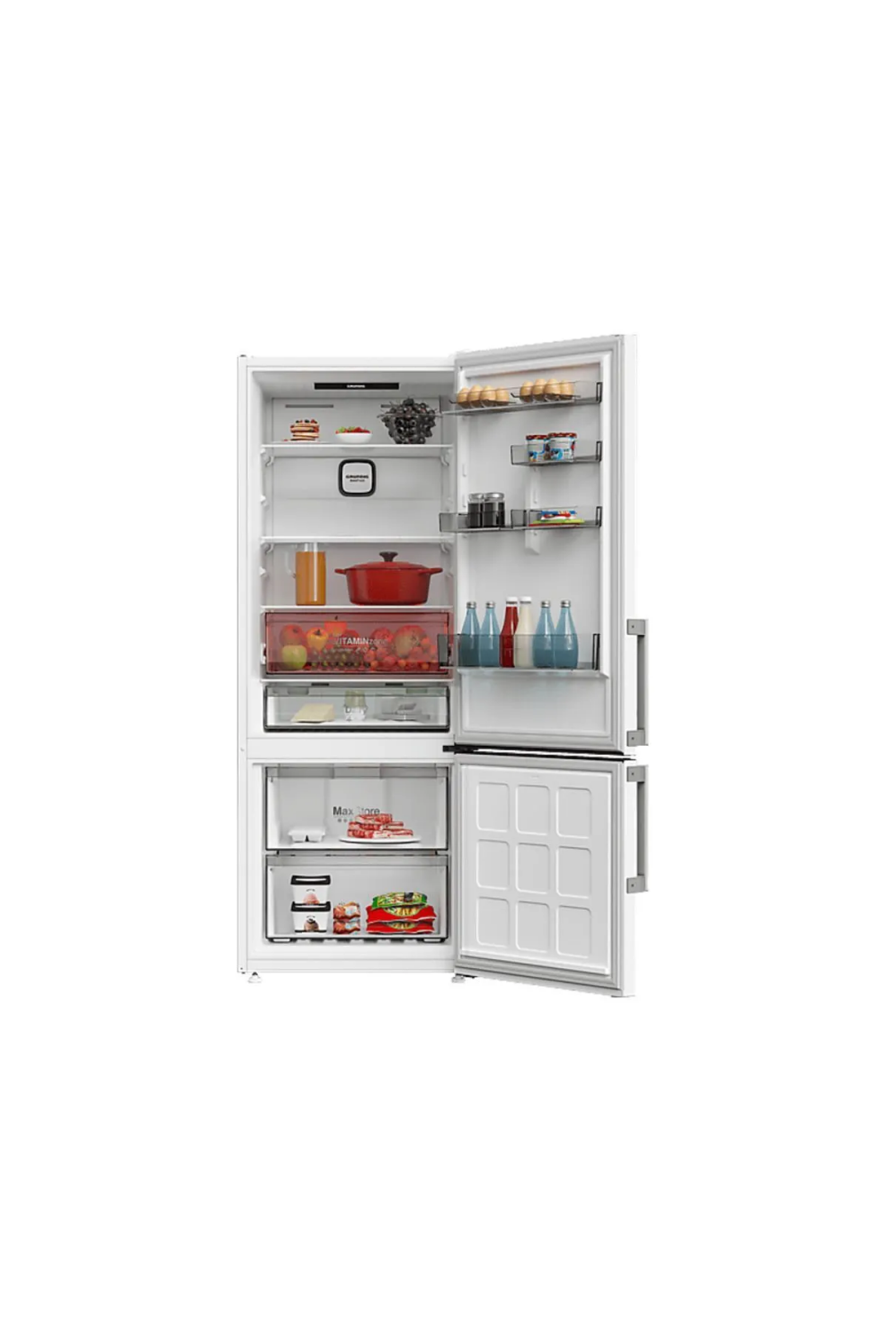 Grundig GPKND 477, No-Frost çift kapılı tasarımıyla hem şıklık hem de yüksek performans sunan bir buzdolabıdır. 477 litre net hacmi, geniş aileler için ideal saklama alanı sağlar. Öne çıkan özellikleri: