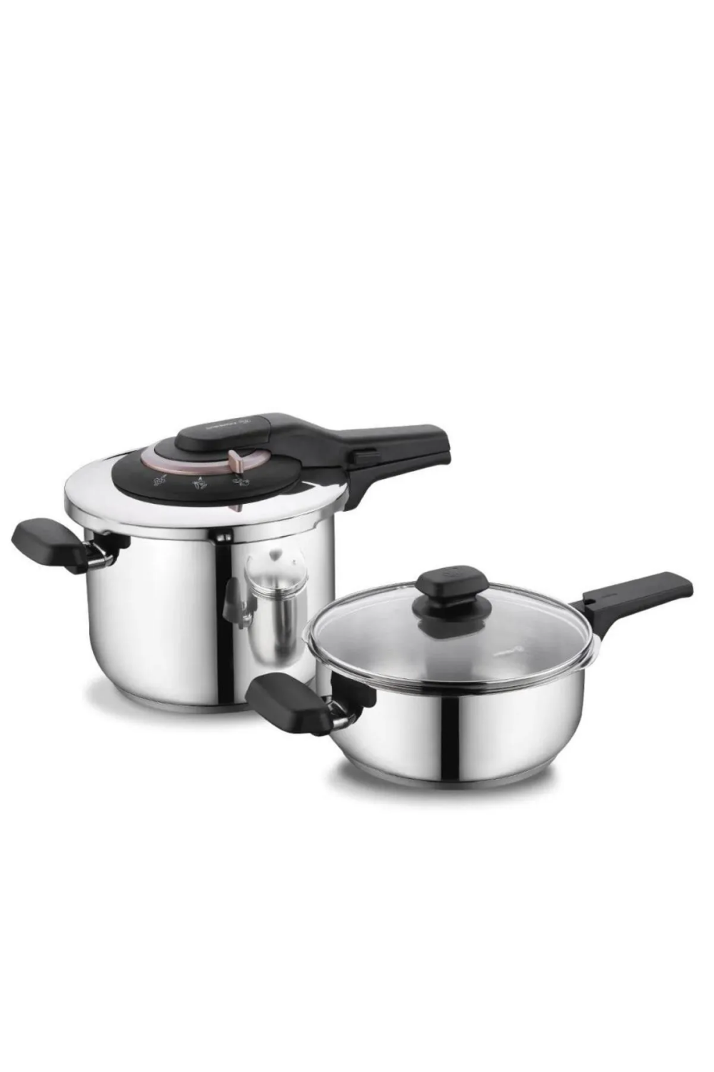 Set içeriği: 3 litre tencere, 6 litre düdüklü tencere, ortak düdüklü kapak ve cam kapak
