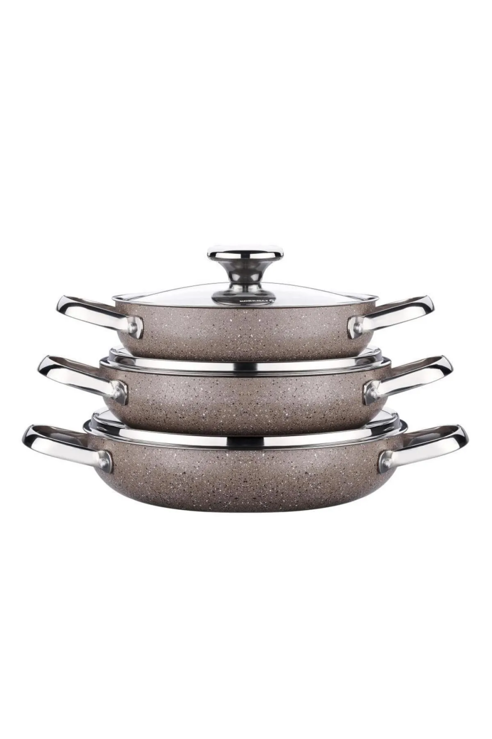 Set İçeriği: 18 cm (0,9 Litre), 20 cm (1,1 Litre) ve 22 cm (1,5 Litre) çaplarında 3 adet omlet tavası ve her biri için uygun şeffaf cam kapak içerir.