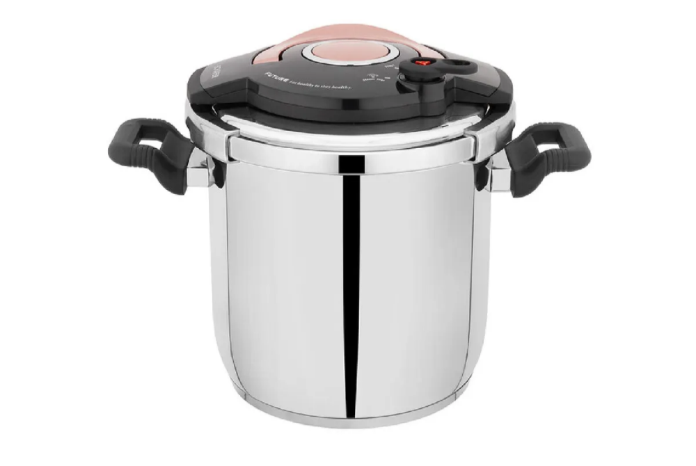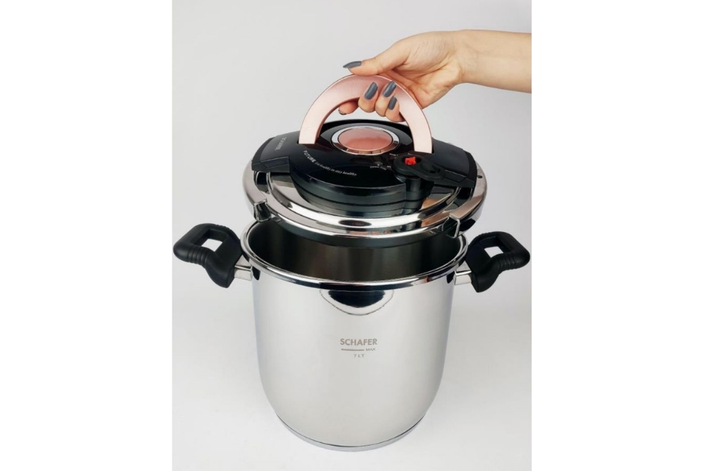 7 litre kapasiteye sahip bu düdüklü tencere, kalabalık aileler ve büyük yemekler için idealdir. Termik kapsül taban ile homojen ısı dağılımı sağlar ve enerji tasarrufu sunar. Kademeli buhar çıkışı yapan ventil sistemi ile güvenli ve kontrollü pişirme imkanı verir. Ergonomik bakalit kulpları ile güvenli kullanım sağlar, tüm ocak tipleriyle uyumludur. Modern siyah ve rosegold tasarımı ile mutfağınıza şık bir dokunuş ekler.