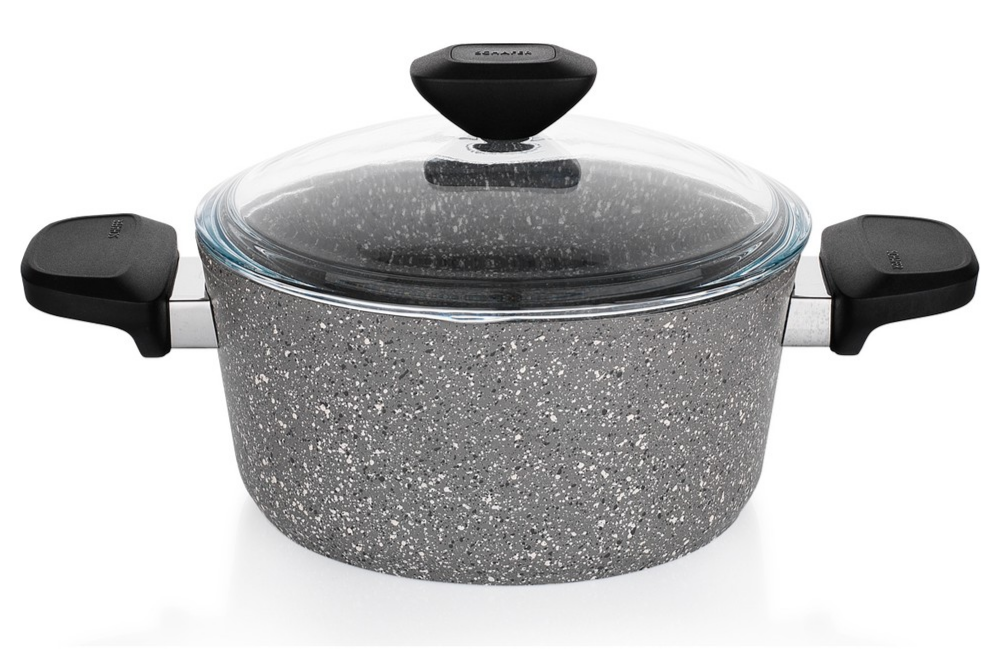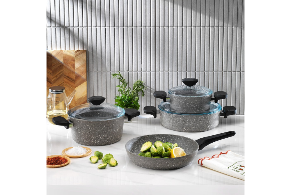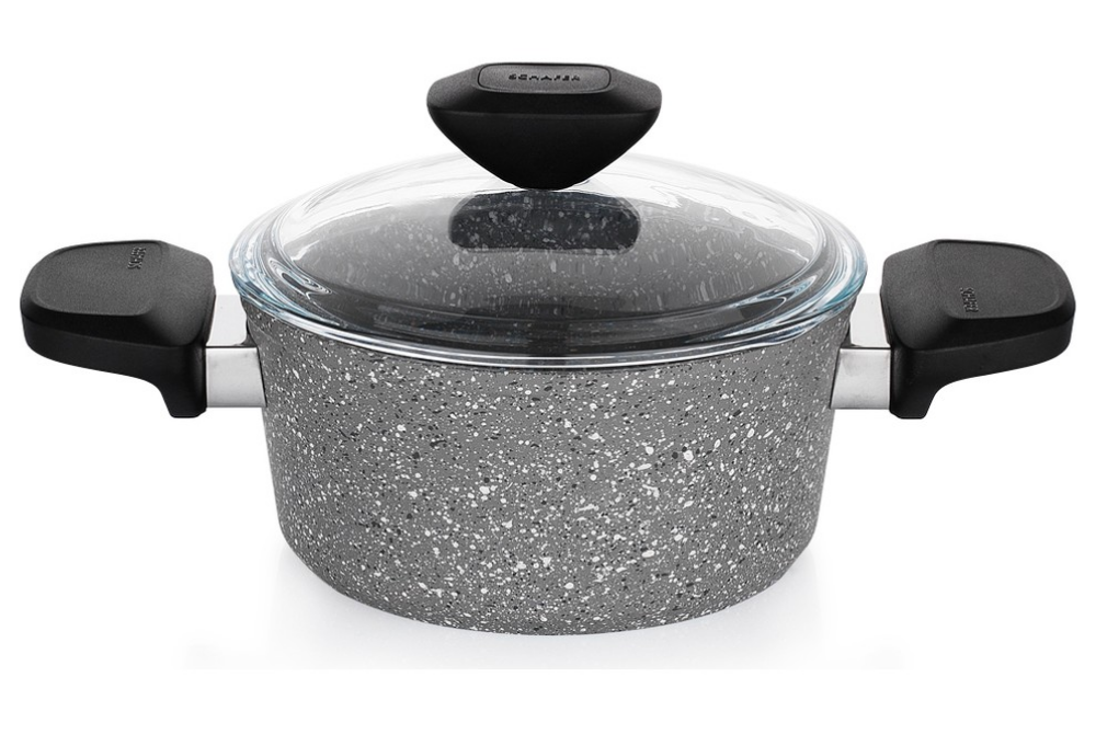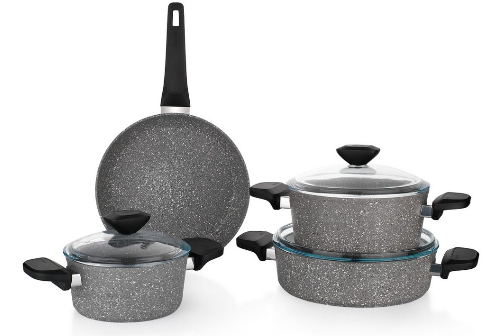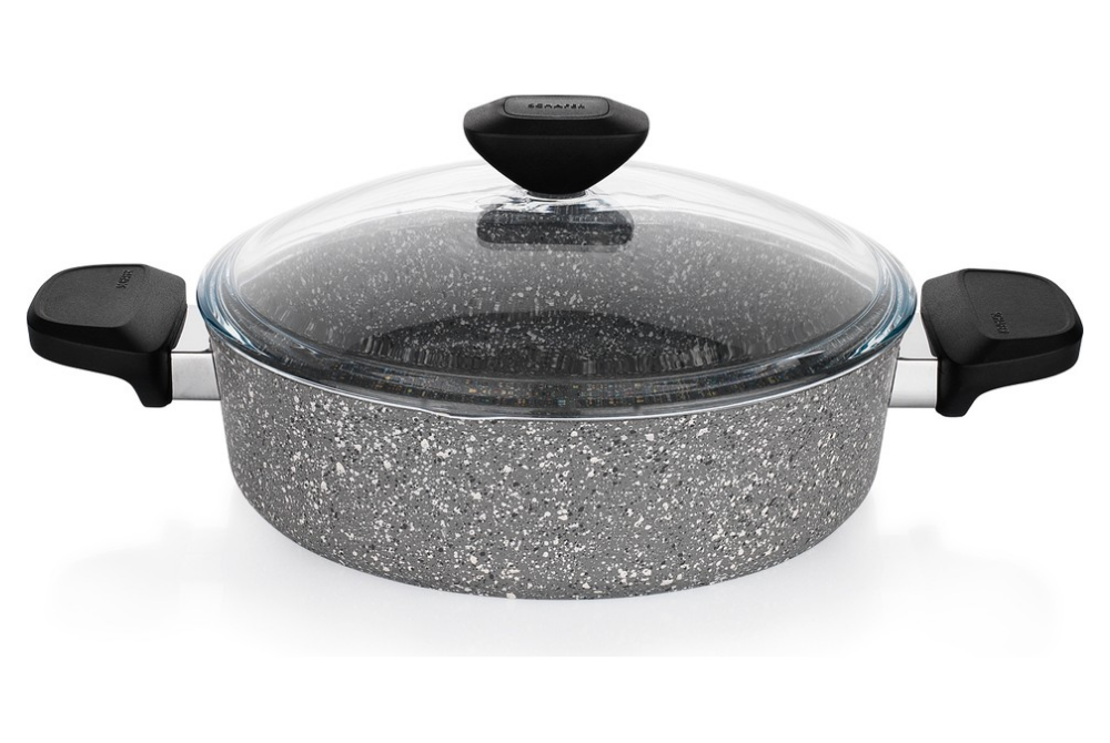 Özellikler: Isıyı eşit ileten alüminyum gövde, güçlendirilmiş granit kaplama, ergonomik bakalit kulplar, yanmaz yapışmaz kaplama