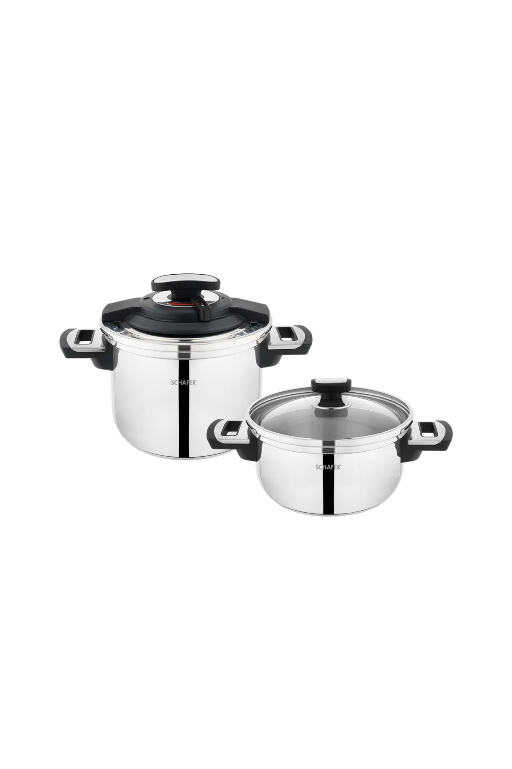 Set içeriği: 22 cm 4 lt düdüklü tencere, 22 cm 6.5 lt düdüklü tencere, 22 cm düdüklü kapak, 22 cm cam kapak