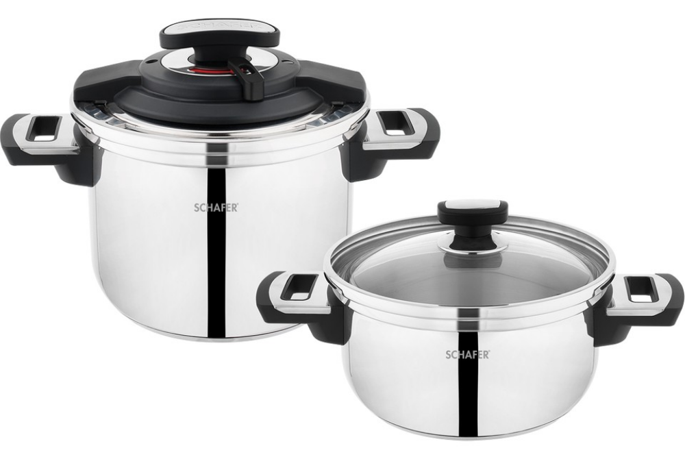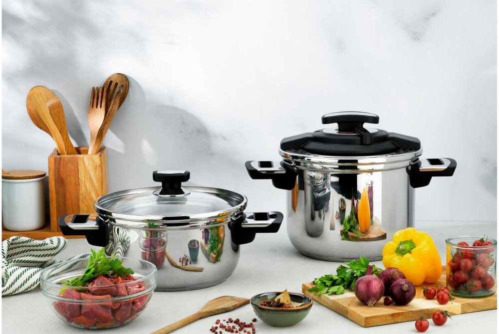 Set İçeriği: 22 cm 4 L düdüklü tencere, 22 cm 6,5 L düdüklü tencere, 22 cm düdüklü kapak, 22 cm cam kapak