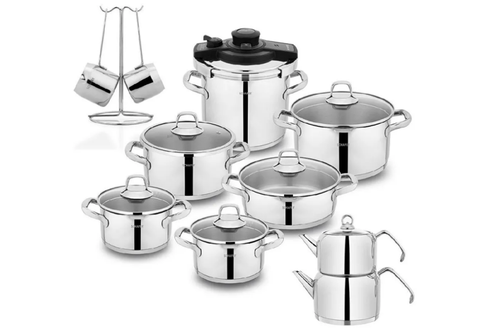 Schafer Jewel Çelik Çeyiz Seti, mutfağınızda ihtiyaç duyacağınız tüm pişirme ekipmanlarını tek bir set içerisinde sunarak hem şıklığı hem de fonksiyonelliği bir araya getirir. Yeni evlenenler ve mutfağını eksiksiz şekilde donatmak isteyenler için ideal olan bu set, modern tasarımı ve dayanıklı yapısıyla uzun ömürlü kullanım sağlar.