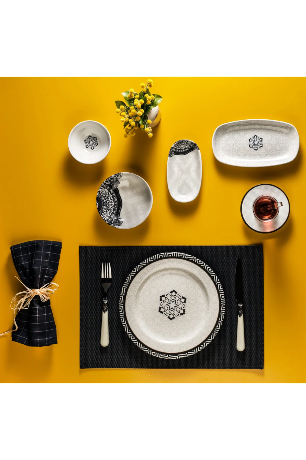 Parça dağılımı: 6 servis tabağı (25 cm), 6 çay bardağı, 6 çay tabağı, 6 çay kaşığı, 4 reçellik, 2 yuvarlak servis tabağı, 1 büyük kayık tabak, 1 küçük kayık tabak
